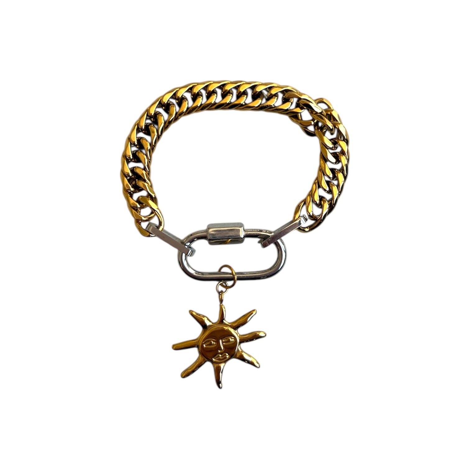 Add a fun twist to your look with the Dual Bracelet- Gold Chain, featuring a chunky chain that combines gold stainless steel with striking silver links. This playful mix of metals brings a unique, eye-catching style to any outfit, perfect for those who love to mix things up.