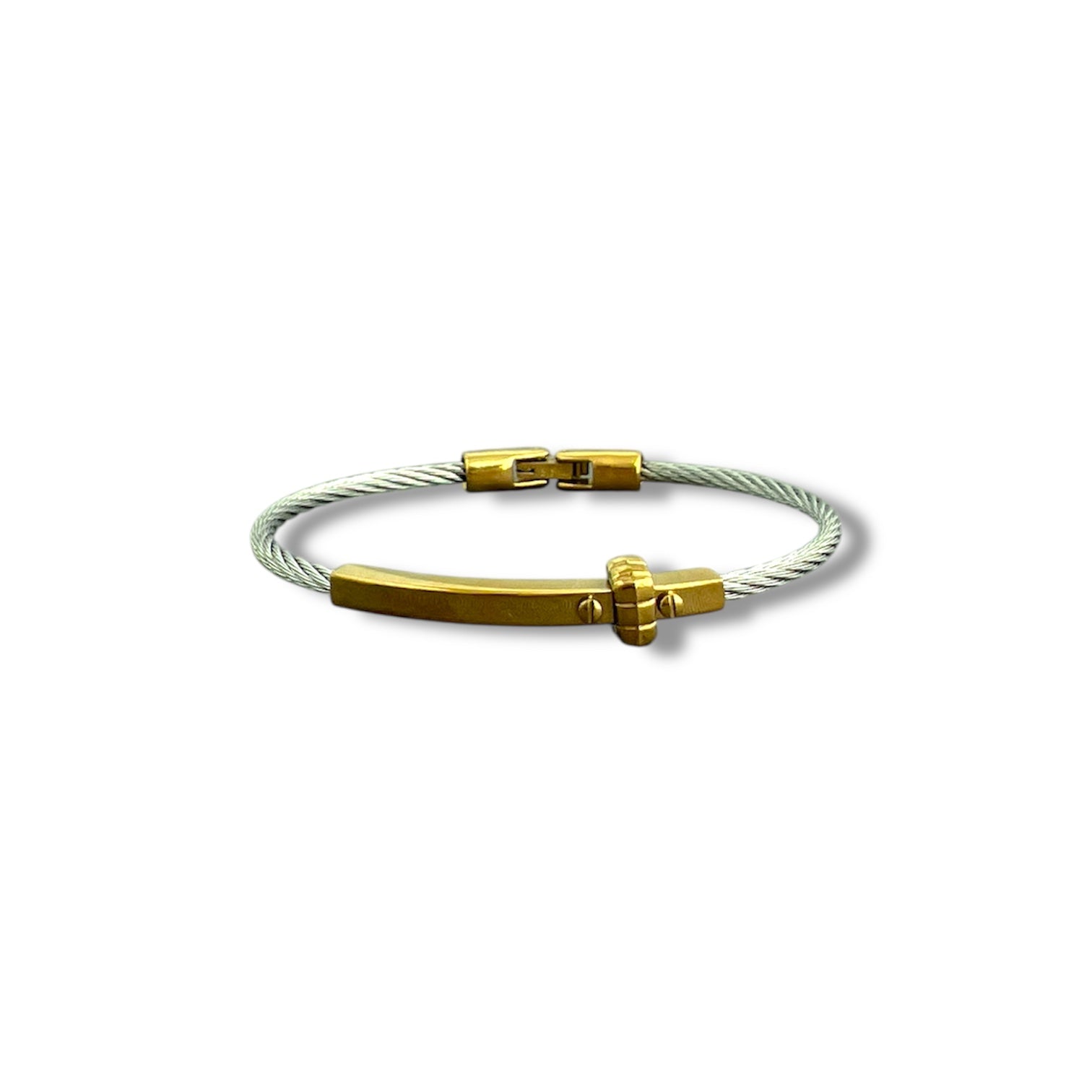 This Gold and Silver Belt Bracelet combines a striking two-tone design with durable stainless steel construction. The gleaming silver bands paired with luxurious gold accents create a versatile piece that works for any occasion. Built to resist tarnishing and daily wear, it's a timeless accessory that keeps its radiant finish.