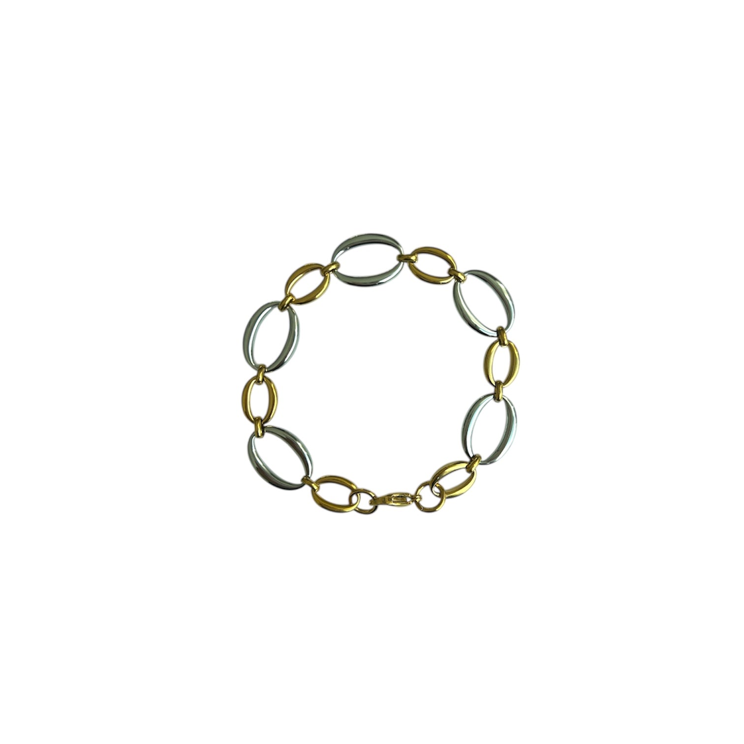 This Gold and Silver Oval Bracelet features elegant oval links in durable stainless steel. The mixed-metal design offers a polished look that works alone or layered, and resists tarnish for everyday wear.