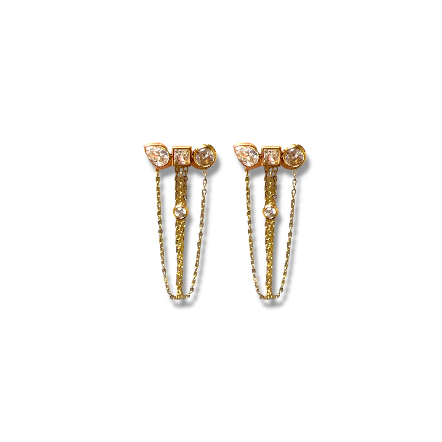 Stunning zircon earrings with cascading gold chains and secure stainless steel closure. Four sparkling zircon pieces dangle gracefully from delicate gold chains, creating movement and shimmer with every wear. Durable and elegant—the perfect accessory for any occasion.