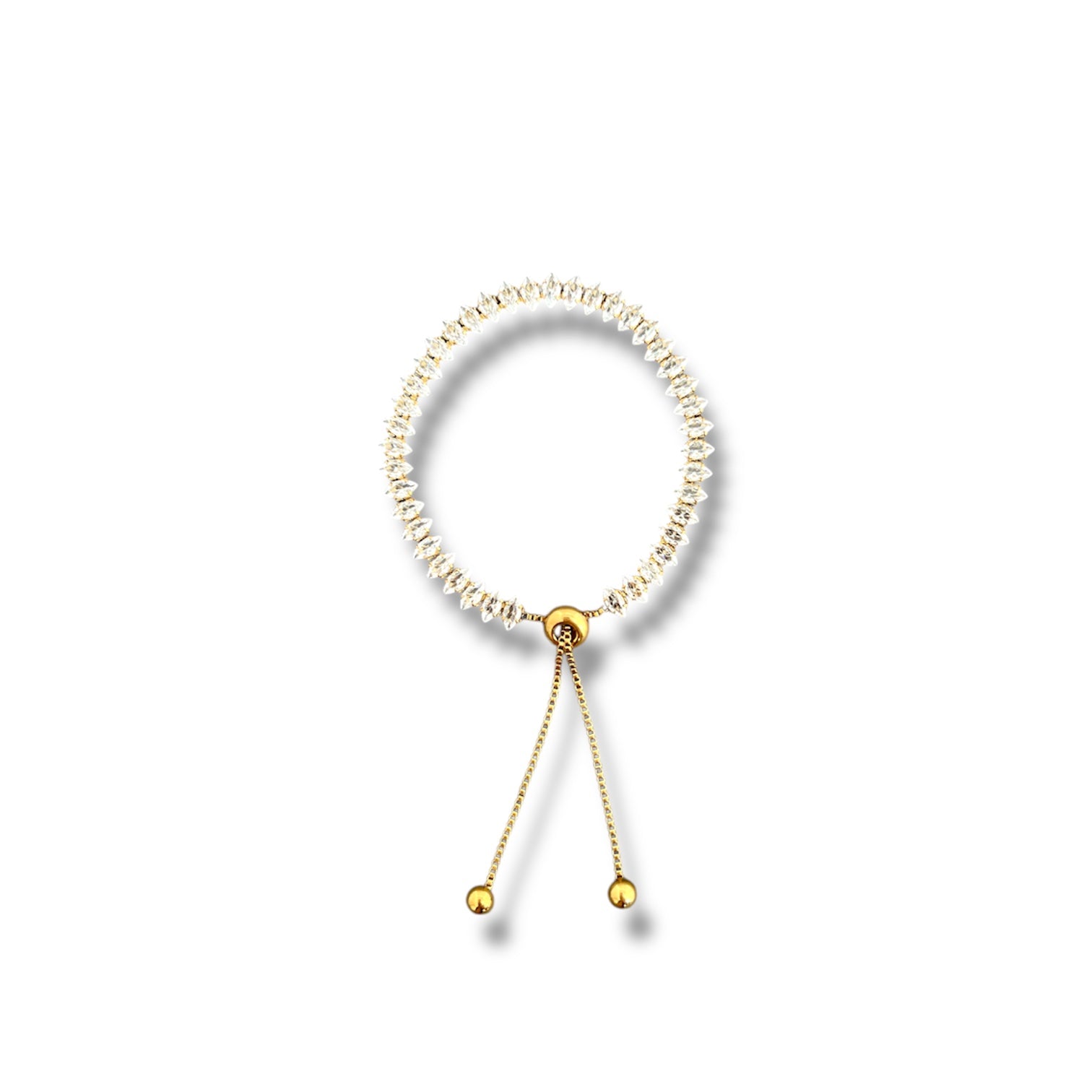 Stunning gold marquise zircon slider bracelet in durable stainless steel. Adjustable fit for any wrist, with brilliant sparkle and effortless comfort. Perfect for any occasion.