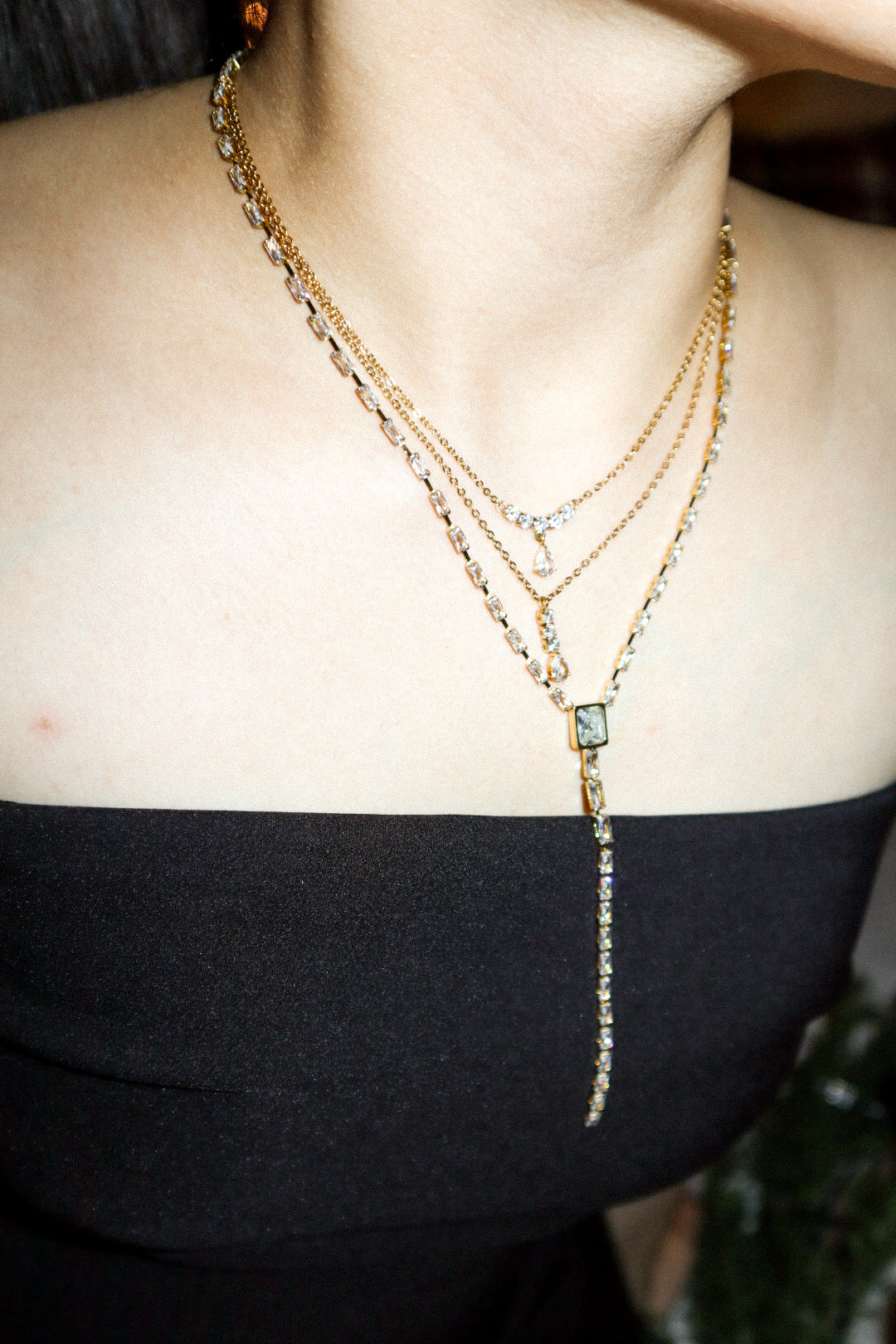 This gold chain necklace features a striking zircon pendant with vertical stones and a dangling accent that sparkles beautifully. Perfect for holidays, special occasions, or everyday wear, it adds instant elegance to any outfit.