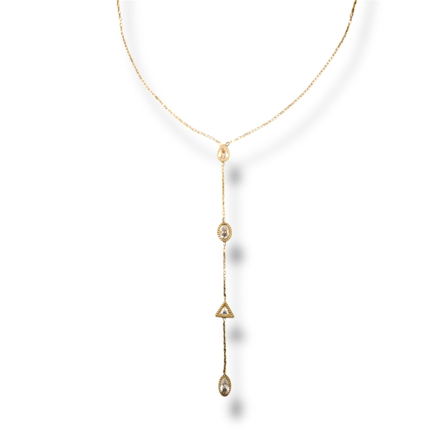 A striking Y-shaped necklace featuring mixed zircon stones that sparkle with every movement. Its geometric design works beautifully with any outfit, adding instant elegance to your everyday style.